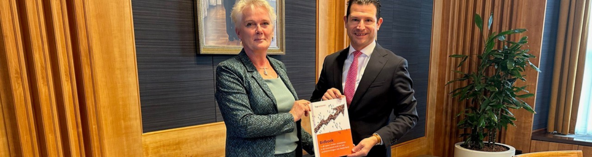 Minister Beljaarts (EZ) bij de overhandiging van het bidbook: ''Investeringen in kennis, technologie en innovatie zijn cruciaal: het kabinet wil dat in 2030 3% van het bruto binnenlands product (bbp) wordt besteed aan onderzoek en ontwikkeling. Daarom investeren we volgend jaar 900 miljoen euro extra via Invest-NL in innovatief MKB en de doorgroei van veelbelovende startups. De subsidie voor Wet Bevordering Speur- en Ontwikkelingswerk (WBSO) stijgt in 2025 naar 1,5 miljard euro. Zo hoeven bedrijven minder belasting te betalen voor hun onderzoek en ontwikkeling en kunnen ze goedkoper innoveren. Bovendien verwachten we de komende jaren de eerste mooie resultaten van de 51 Nationaal Groei Fonds projecten waarin we ruim 11 miljard investeren.''